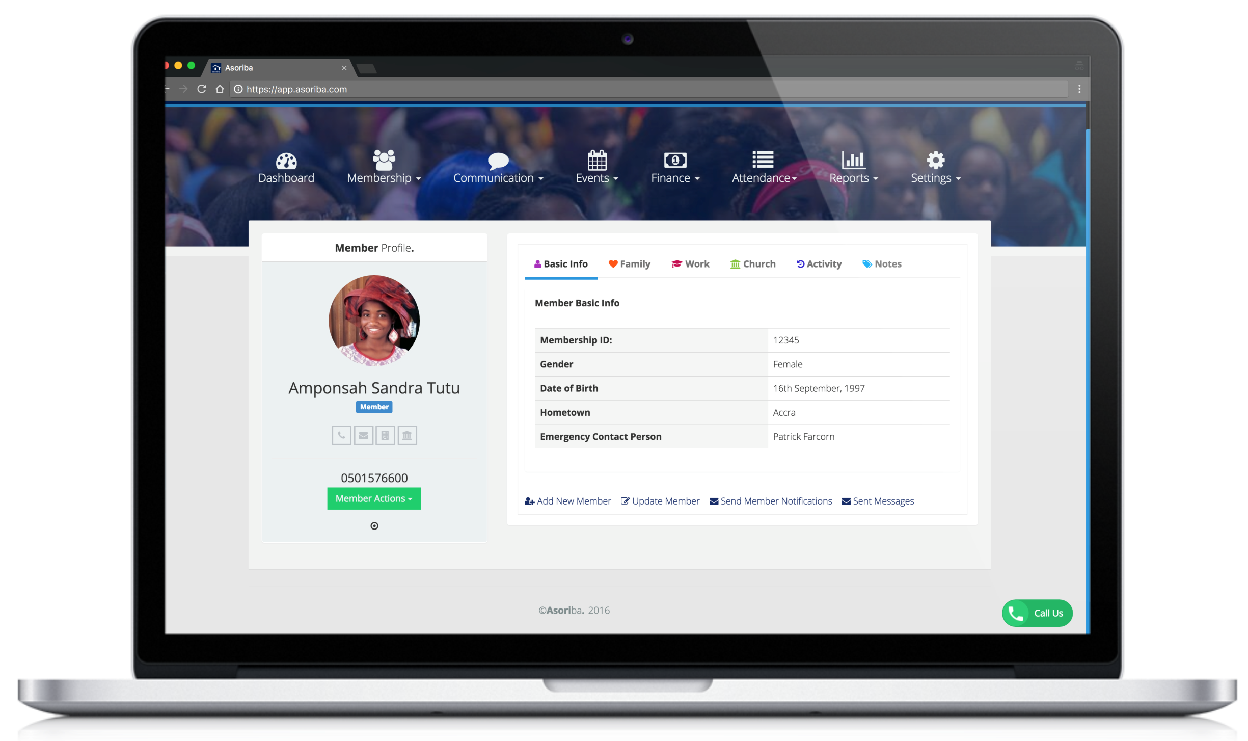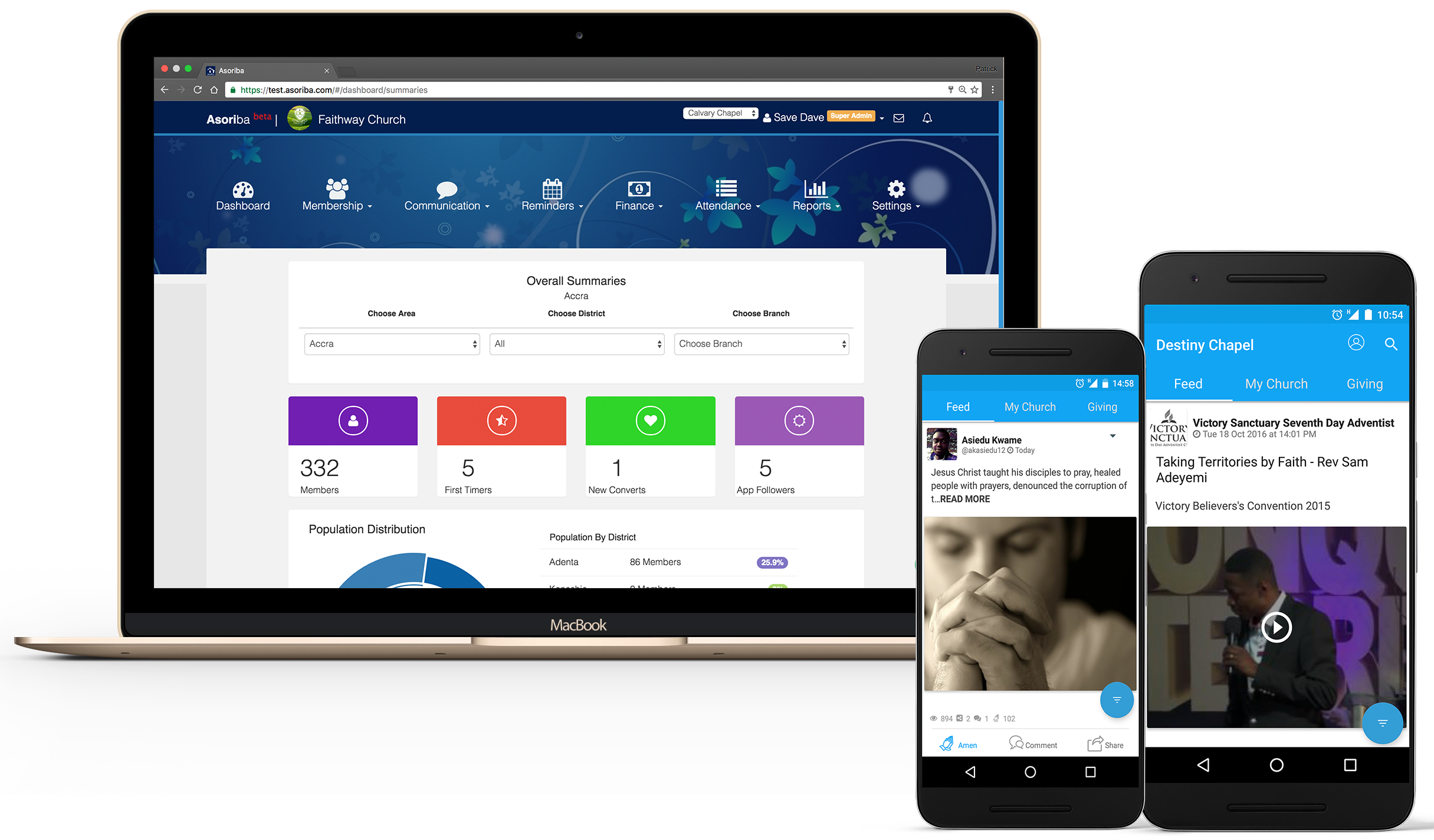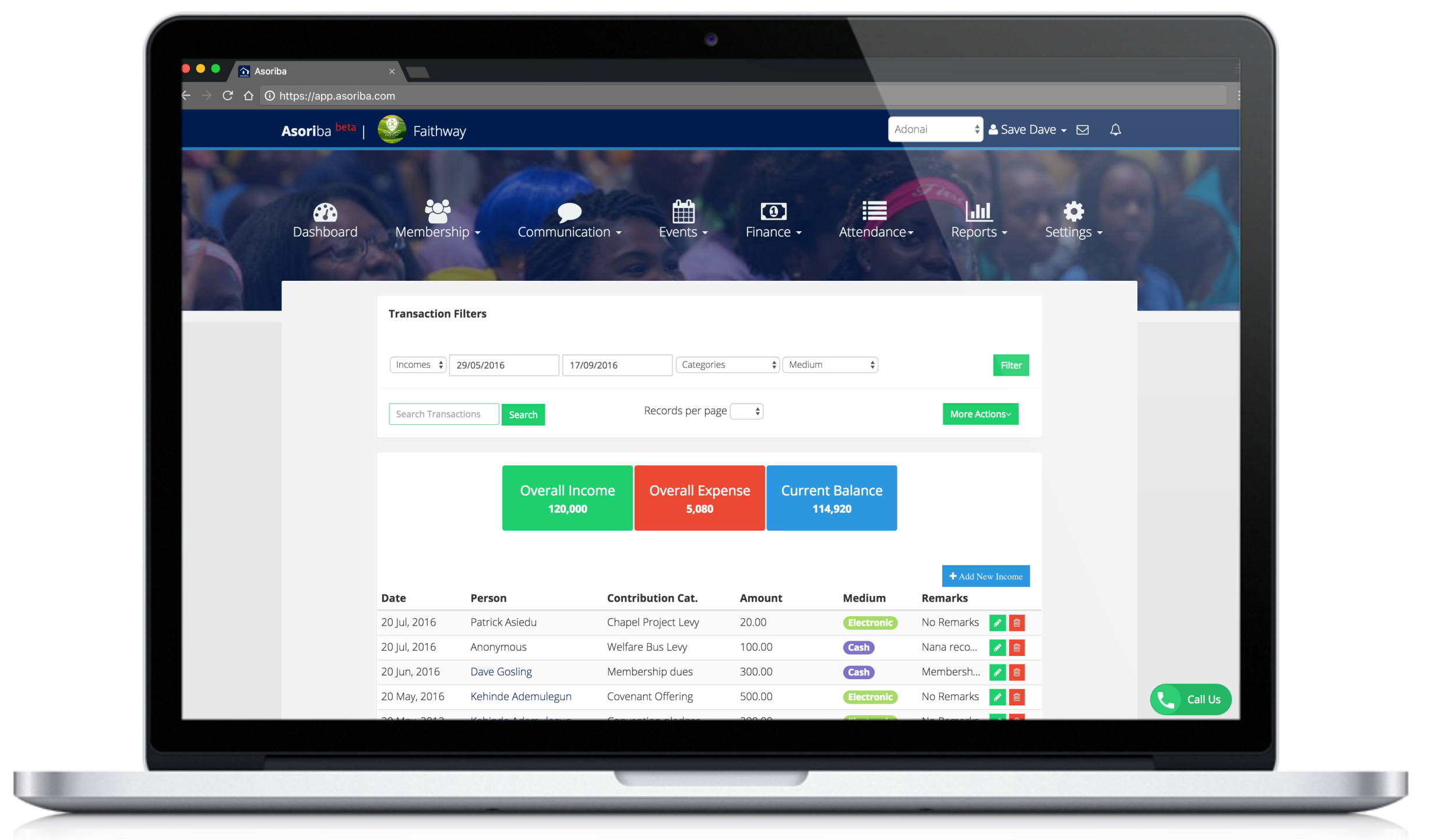 Capture deep member data and receive notifications about special dates like birthdays and wedding anniversaries. Record family relationships, work, education and any other information you find relevant. View tithes, contributions, prayer request history, groups joined and attendance frequency of a member. Seamlessly transfer a member to another branch of your church and communicate via our asoriba mobile app.